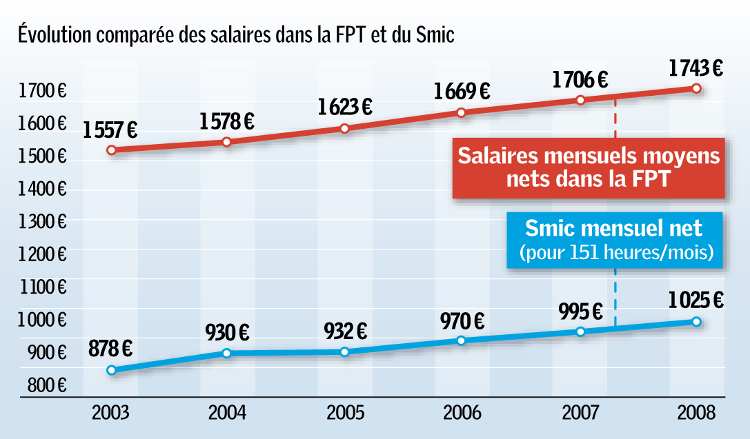En effet, le traitement minimum dans la fonction publique est ajusté sur le montant du Smic. Les rémunérations du bas de l’échelle n’augmentent pas faute d’évolution du point d’indice et l’écart se réduit donc mécaniquement.
