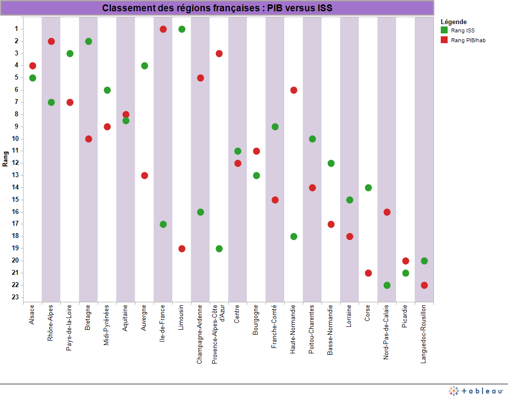 Classement des régions françaises en 2008 selon le Produit intérieur brut (PIB) par habitant et l'indicateur de santé social (ISS). Source : Florence Jany-Catrice. (Cliquer sur l'image pour l'agrandir)