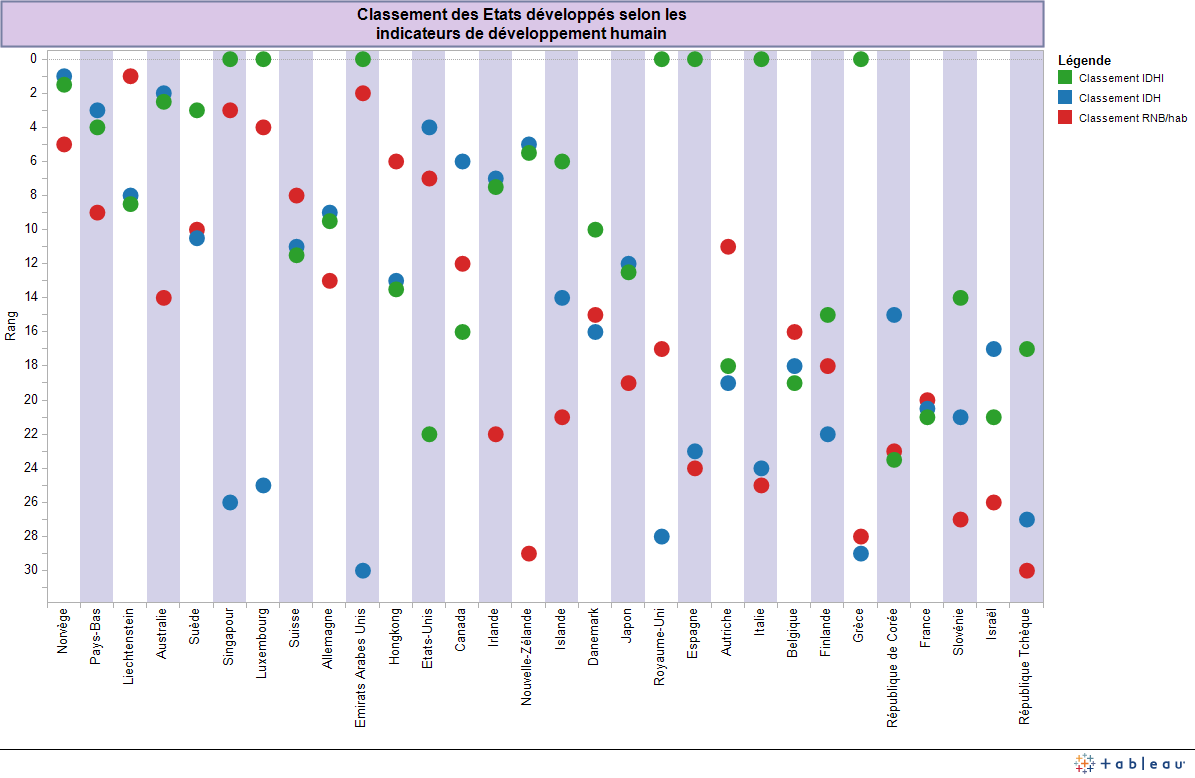 Classement des Etats développés selon le revenu national brut (RNB) par habitant (en dollars constants de 2005) ; l'indice de développement humain (IDH) ; l'indice de développement humain ajusté aux inégalités (IDHI). Source : Rapport sur le développement humain 2011. Programme des Nations unies pour le développement humain (Pnud). (Cliquez sur l'image pour l'agrandir)
