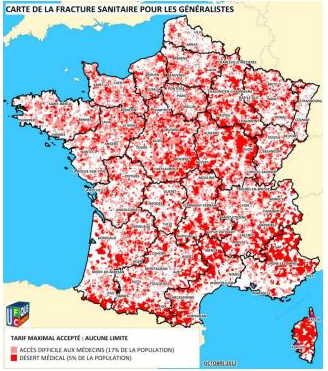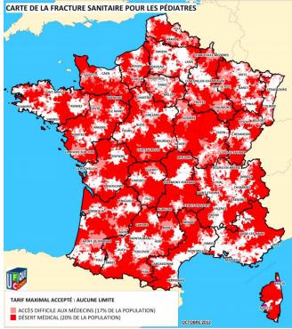 Carte de la fracture sanitaire pour les médecins généralistes sans limite de tarifs (en rouge, les déserts médicaux et en rose, les zones où l’accès aux médecins est difficile)En ce qui concerne les pédiatres, l’inégalité se fait davantage sentir. 28 % de la population souhaitant avoir recours à un pédiatre qui ne pratique pas de dépassement d’honoraires vit dans un désert médical.