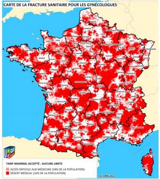 Carte de la fracture sanitaire pour les ophtalmologistes sans limite de tarifs (en rouge, les déserts médicaux et en rose, les zones où l’accès aux ophtalmologistes est difficile)Enfin, pour les gynécologues, la situation est sensiblement la même que pour les ophtalmos. Ce sont alors 54 % des personnes qui vivent dans un désert gynécologique si elles ne souhaitent pas avoir recours à un spécialiste avec des dépassements d’honoraires.