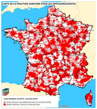 Carte de la fracture sanitaire pour les pédiatres sans limite de tarifs (en rouge, les déserts pédiatriques et en rose, les zones où l’accès aux pédiatres est difficile)Le Mans, Besançon – En ce qui concerne les ophtalmologistes, les inégalités sont encore plus importantes. 13 % des personnes qui sont dans une situation aisée habitent dans un désert médical.