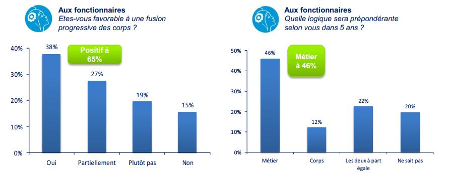 D’ailleurs, les fonctionnaires sont plutôt favorables à une fusion progressive des corps. Mais plus la catégorie est élevée, plus la part des « pour » diminue (catégorie C : 73 % ; B : 66 % ; et A : 63 % ).
