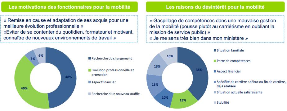 Ils sont également pour plus de mobilité, à 76 %, sachant que plus le niveau de responsabilité est élevé, plus cette attente est forte. « En parallèle, 83 % des fonctionnaires demandent un meilleur accompagnement de la mobilité et 8 % d’entre eux se déclarent motivés, mais déplorent le manque d’opportunités », précise l’étude.