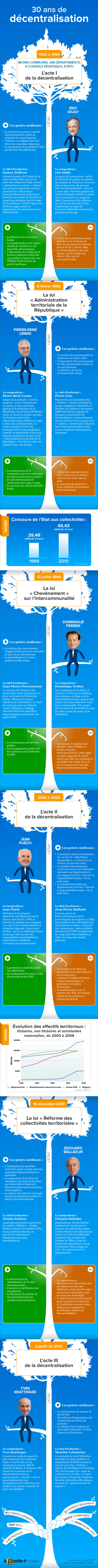 Dans une infographie en forme de fresque ludique, La Gazette revient sur trente ans de décentralisation au profit des collectivités territoriales. Un mouvement mené à pas lent, incarné par des personnages de premier plan comme Gaston Defferre ou Edouard Balladur et des hommes de l’ombre, tels Eric Giuily et Pierre-René Lemas. Récit d’une longue marche jalonnée par la création des communautés de communes en 1992 et l’avènement de la République décentralisée en 2003. Réussites et échecs : La Gazette fait le bilan. En toute subjectivité !