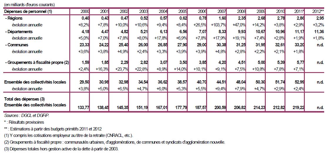Evolution des dépenses de personnel dans les collectivités locales de 2000 à 2012. Cliquez sur le tableau pour l'agrandir
