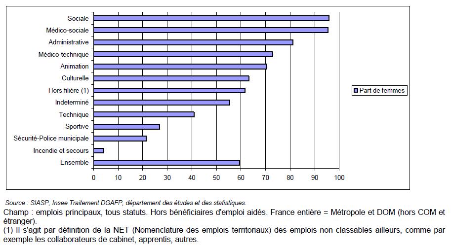 Part de femmes par filière d'emploi dans la FPT (hors assistantes maternelles) au 31 décembre 2010 en France (Métropole + DOM)
