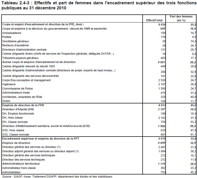 Effectifs et part de femmes dans l'encadrement supérieur des trois fonctions publiques au 31 décembre 2010. Cliquez sur l'image pour l'agrandir.