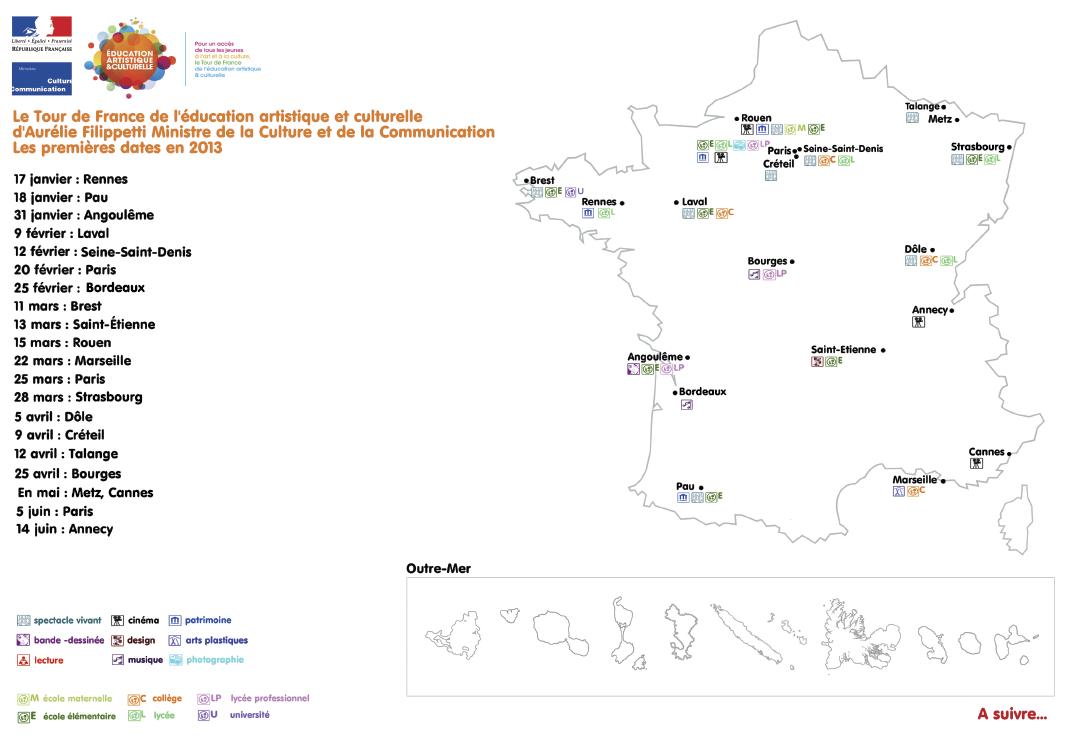 Tour de France – Autre action en cours : un Tour de France de l’éducation artistique et culturelle. Une vingtaine d’étapes sont d’ores et déjà prévues d’ici juin prochain.