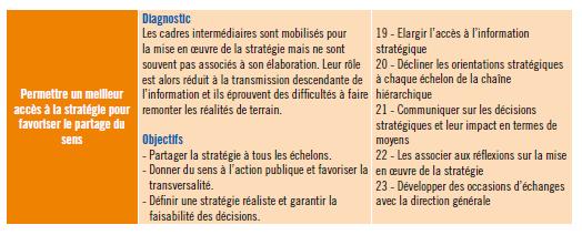 Les associer à la mise en œuvre de la stratégie – Ces contraintes ne révèlent cependant pas de mal-être fort de la part de ces agents qui se déclarent plutôt épanouis dans leur fonction. Les élèves administrateurs de l’Inet concluent leur étude par 23 préconisations destinées à corriger les difficultés pointées. Parmi celles-ci, le repérage et l’accompagnement des cadres intermédiaires potentiels, le développement de leur autonomie de gestion humaine et financière ou encore leur association à la mise en œuvre de la stratégie.