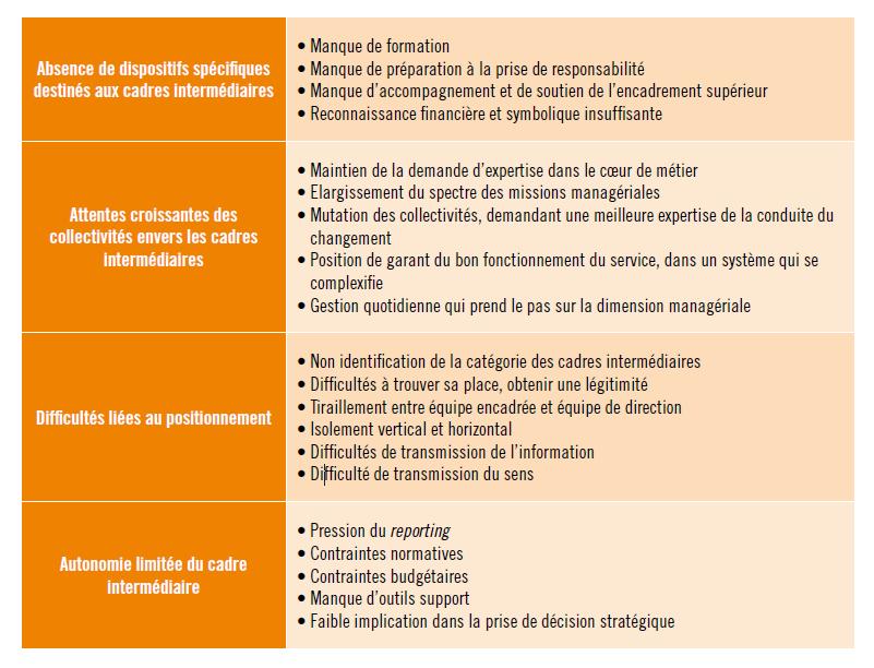 Très peu accompagnés – Le tiraillement entre deux postures différentes est également à l’origine de plusieurs difficultés. Alors que leurs missions managériales tendent à prendre davantage de poids, les cadres intermédiaires sont très peu accompagnés sur ce volet : les recrutements sont encore très axés sur l’expertise métier, les compétences managériales ne figurent pas forcément dans leur fiche de poste, les formations aux outils de management sont encore peu nombreuses et pas toujours adaptées…