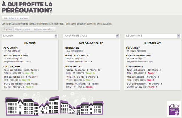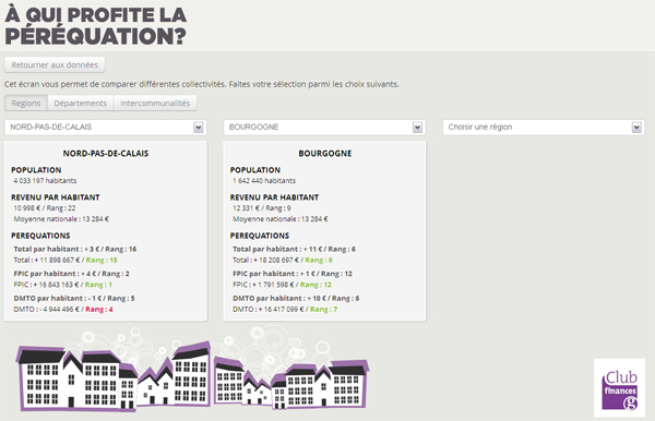 L’application met en évidence les contradictions du système. Ainsi, l’ensemble des collectivités et groupements de communes du Nord-Pas-de-Calais, qui affichent le revenu moyen par habitant le moins élevé de France métropolitaine (10 998 €/hab. rang 22), perçoivent 3 €/habitant au titre de la péréquation horizontale, alors que la Bourgogne, 9e région la plus riche en terme de revenu par habitant (12 300 €), perçoit 11 € par habitant au titre de la péréquation horizontale, (rang 9), censée corriger les inégalités entre territoire. Le débat est (re)lancé…
