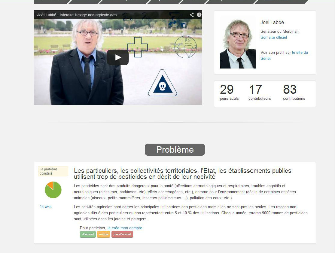 La consultation n'est ouverte que depuis 24 heures et elle compte déjà 17 contributeurs et 83 contributions (vendredi 21 juin 2013). Chacun, citoyen, élu, parlementaire, peut apporter son grain de sel à l’élaboration de cette proposition de loi visant à interdire l’usage non-agricole des pesticides sur le territoire national. Il suffit de se rendre sur la plateforme www.parlement-et-citoyens.fr. Vous avez jusqu'au 20 juillet pour participer. Le texte sera inscrit à l'ordre du jour du Sénat en octobre 2013.