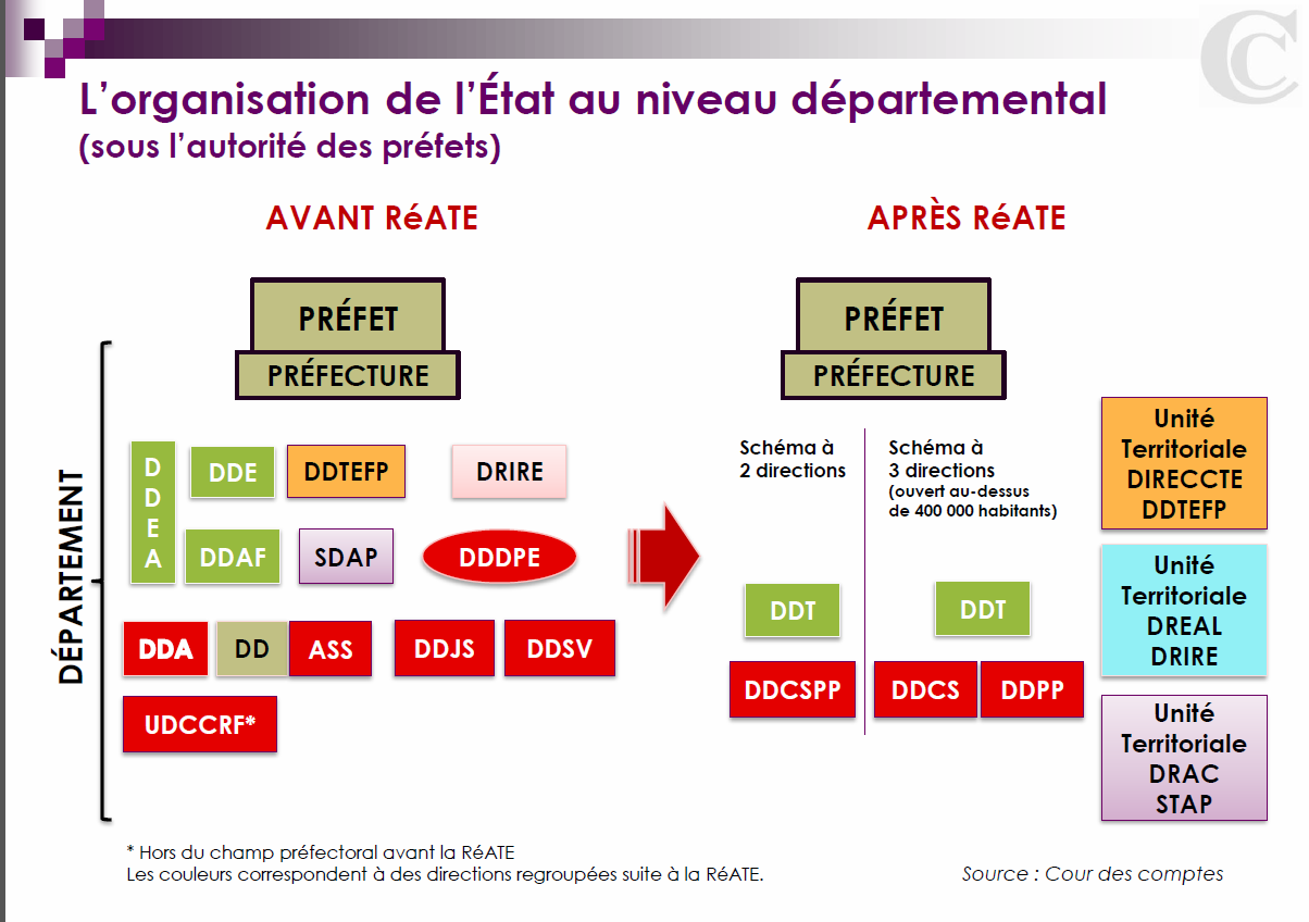 Au titre de « l’action à la bonne échelle », Didier Migaud pointe aussi les ressorts des cours d’appel qui devraient être calqués sur les régions en mettant fin aux survivances historiques, par exemple les quatre cours d’appel dont relève le territoire de la région Rhône-Alpes : Lyon, Grenoble, Chambéry et Nîmes. De même, des regroupements interdépartementaux pourraient avoir leur pertinence pour des missions exercées par des effectifs trop faibles dans des départements, par exemple pour les services chargés du contrôle vétérinaire, dont le rôle a été mis en avant lors du scandale de la viande de cheval.