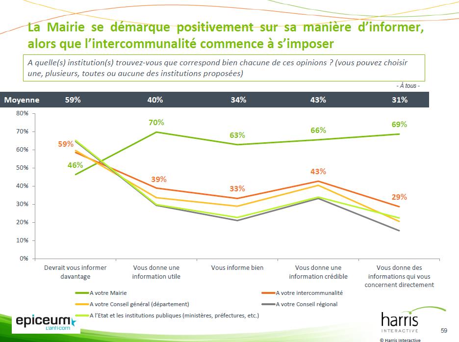 L’info donnée par les collectivités modifie les comportements mais pas l’image des élus. Cliquez sur l’image pour l’agrandir.L’étude veut montrer que « la communication agit sur le civisme, en incitant à participer aux prochaines élections ». Or, plus de la moitié des sondés reconnaissent que l’information locale ne changera rien à leur participation aux votes. C’est particulièrement vrai pour les 18-34 ans, alors qu’une majorité des plus de 65 ans se disent incités à voter à la lecture des infos locales.