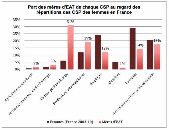 Idem chez les mères des EAT qui sont à 31 % des CSP + pour 7 % de la population, 34 % avec les retraitées.