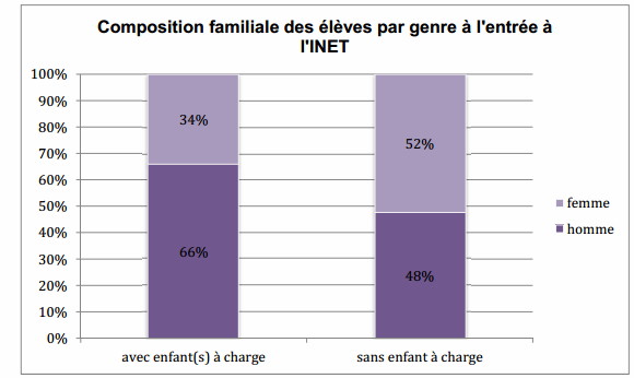 « Il serait intéressant, avancent les auteurs de l’étude, d’avoir une enquête qualitative complémentaire pour étudier si c’est la charge de famille qui décourage les femmes à se lancer dans la préparation (et le succès) du concours de l’INET ». Les parents de familles monoparentales, en majorité des femmes, restent très rares : seuls 6 % vont s’asseoir sur les bancs de l’Inet, pour 20 % dans le reste de la population.