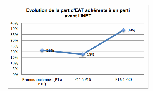 Dernières promotions très politisées – Troisième caractéristique, les élèves de l’Inet, les élèves administrateurs territoriaux ( EAT), s’engagent : 27 % déclarent avoir adhéré à un parti politique alors que la population française ne compte que 2 à 3 % d’inscrits à un parti. Les dernières promotions sont encore plus politisées (39 % pour les cinq dernières) quel que que soit le concours. Très peu ont cependant exercé un mandat politique (5 élèves) ou syndical (6 élèves). ,