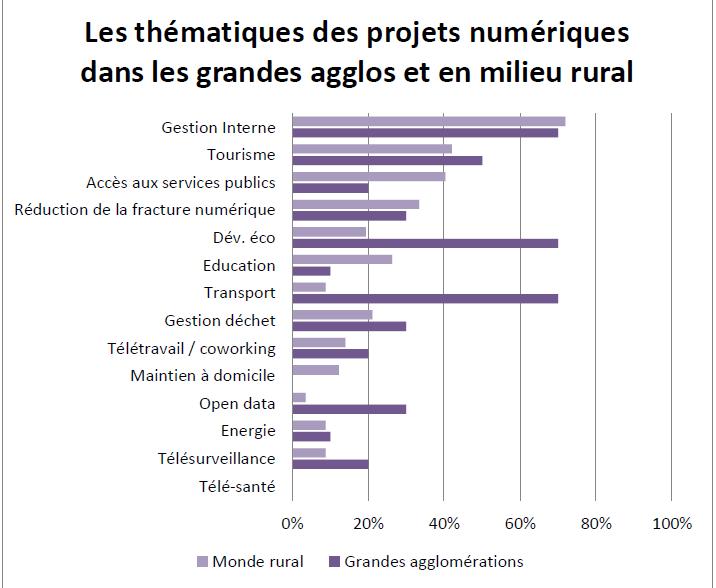 En 2013, près de 70 % des projets numériques intercommunaux portent ainsi sur la dématérialisation des procédures (notamment financières), la gestion des ressources humaines, les informations géographiques, la commande publique, etc.