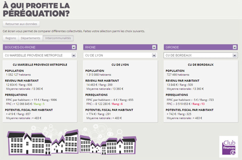 Par exemple, la consultation simultanée des fiches des communautés urbaines de Marseille, Lyon et Bordeaux permet de comparer leurs revenus moyens par habitant ou leurs potentiels fiscaux et leur niveau de contribution ou de bénéfice du FPIC.