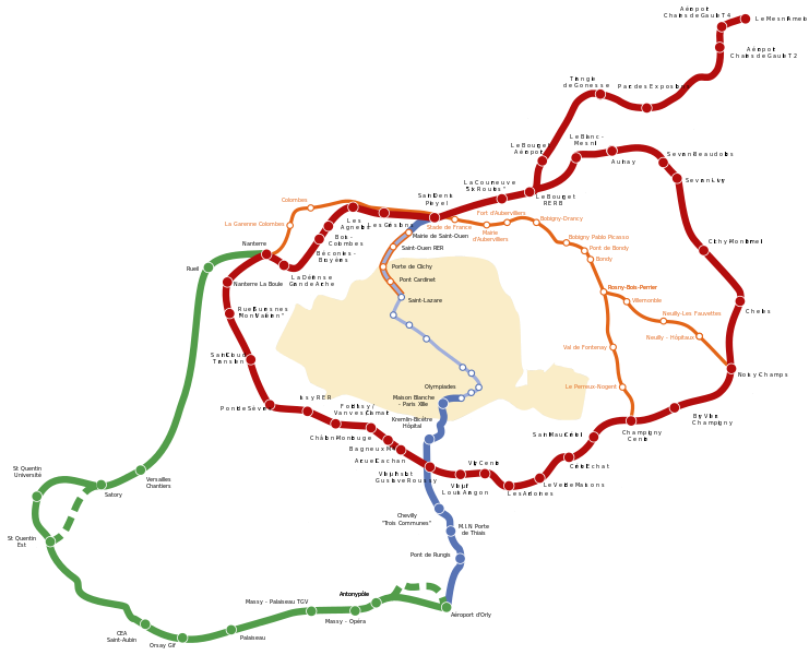 Métro automatique pour économiser – Ainsi, la liaison vers l’Est entre Rosny-Bois-Perrier et Noisy-Champs se transforme en prolongation du métro 11. De même, la ligne verte entre Orly et Versailles (ligne 18), tout comme l’Arc Grand-Est Pleyel-Le Bourget et ses deux branches Le Bourget-Roissy (17) et Le Bourget-Noisy-Champs (18) seront opérées automatiquement : « une bien meilleure solution qui apportera une offre plus cadencée » qu’un métro à grande capacité, indique l’Etat : « Le matériel a été adapté aux besoins identifiés » explique le préfet de région Jean Daubigny. « Nous allons ainsi économiser trois milliards », se félicite Jean-Marc Ayrault.