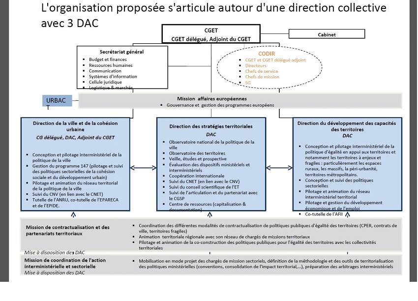 Organigramme – Le CGET sera dirigé par un commissaire général et un commissaire général délégué (également directeur de la ville et de la cohésion urbaine). Il sera composé de trois directions :