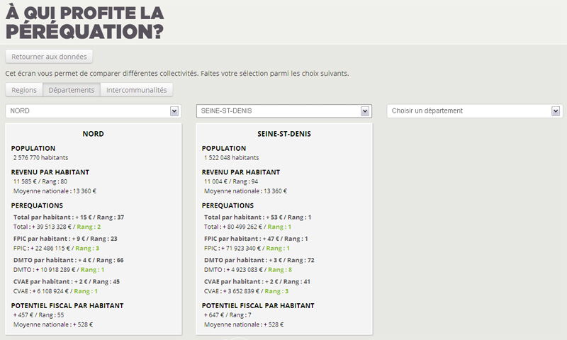 L’ordre est encore différent si l’on raisonne en euro par habitant, avec la Seine-Saint-Denis, toujours devant, toutes péréquation confondues, mais devant la Creuse et la Lozère :