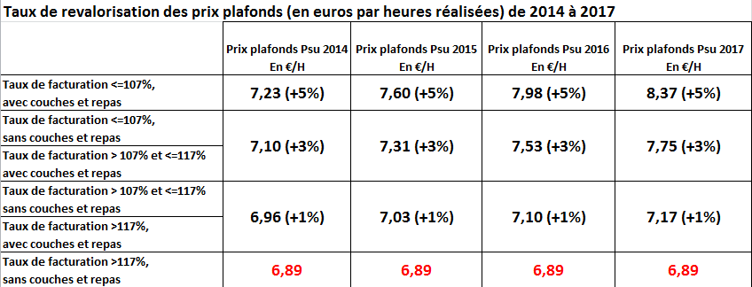 Or, d’après la Cnaf, « il existe un écart grandissant entre les heures facturées aux familles et les heures de présence réelle des enfants. » Une dérive que la Cour des comptes avait pointée dans son rapport de novembre 2013 recommandant à la Cnaf d’inciter les gestionnaires à réduire cet écart. Avec les nouvelles modalités de calcul du prix plafond de la PSU, qui varie désormais en fonction de ces trois critères (Voir tableau ci-dessous), la Cnaf entend rétablir une équité de traitement entre toutes les familles et tous les gestionnaires.