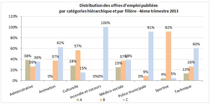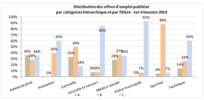 Hormis ce résultat, la distribution des offres par catégorie reste relativement stable entre fin 2013 et le premier trimestre 2014. La part des catégorie C est importante, « ce qui reflète la composition des emplois de la fonction publique, qui compte 77 % de « C » », insiste René Canfin.