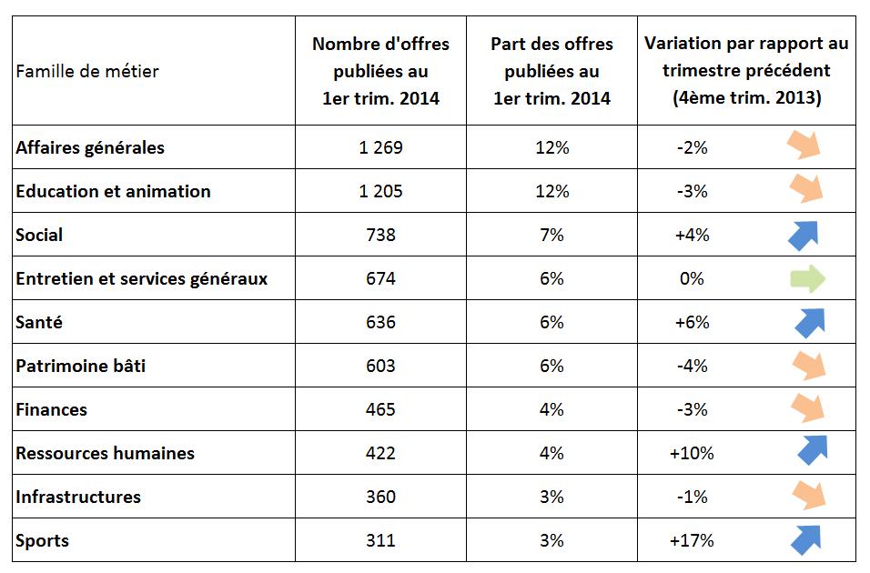 Le baromètre trimestriel de l’emploi local examine aussi les familles de métier qui publient le plus d’offres. « Affaires générales » et « Education et animation » se taillent la part du lion, mais la proportion est en baisse par rapport à fin 2013.
