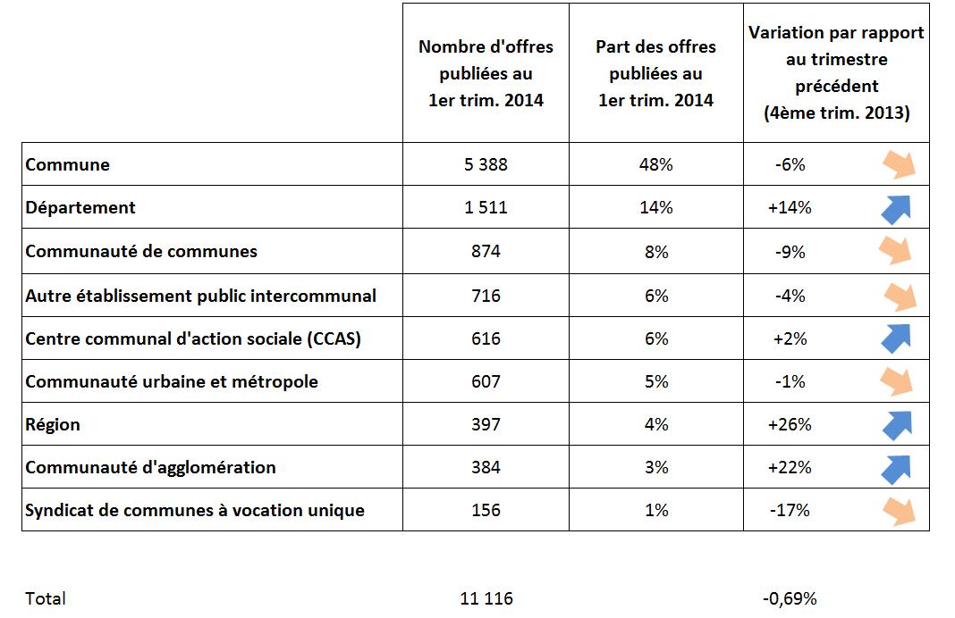 11 596 offres ont été publiées sur les bourses de l’emploi des centres de gestion au premier trimestre 2014, contre 11 642 au 4e trimestre 2013, soit une très faible baisse de – 0,4 %. Ce sont les communes qui recrutent le plus (48 % des offres publiées), mais cette proportion est en baisse par rapport au dernier trimestre 2013 (- 6 %). Viennent ensuite les départements (+ 14 %).
