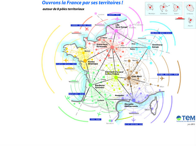 La Corse avec PACA – Le résultat est décoiffant. En lieu et place des 22 actuelles régions métropolitaines, 8 « pôles territoriaux » voient le jour. Parmi ceux-ci, un Grand Paris / Normandie court jusqu’à la mer, glanant au passage « les marches » de l’Ile-de-France (La Marne, l’Aube, l’Yonne, le Loiret, le Loir-et-Cher et la même la Sarthe).