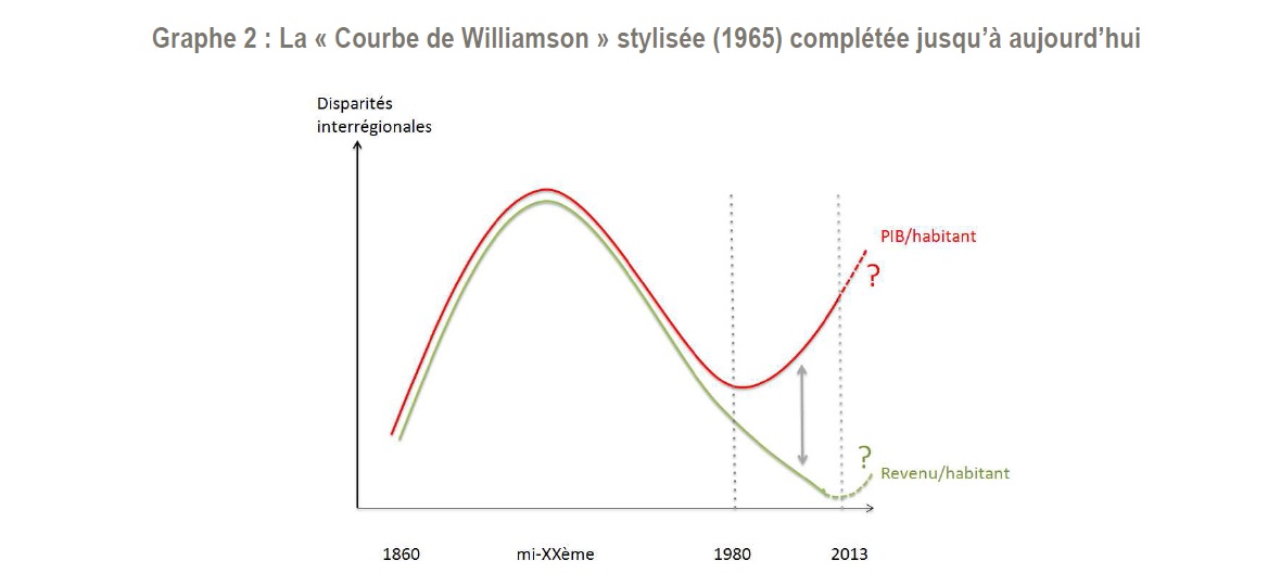 Ils appuient leur analyse sur le constat d’une inversion de tendance entre l’évolution des PIB par habitant régionaux et celle du revenu par habitant. Alors que pendant les 30 glorieuses, il y avait un lien direct entre la création de richesse (PIB) et le revenu des territoires, ces derniers évoluent maintenant de manière divergente, « car la plus grosse part des revenus des ménages provient de sources non marchandes (pensions de retraites, salaires publics, prestations sociales) ».
