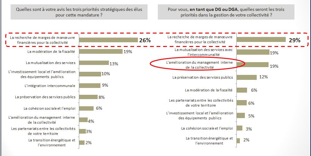 Leurs priorités de gestion sont sensiblement les mêmes que celles des élus, même s’ils font apparaître dans leur « top 3 » l’amélioration du management interne, contrairement aux élus.