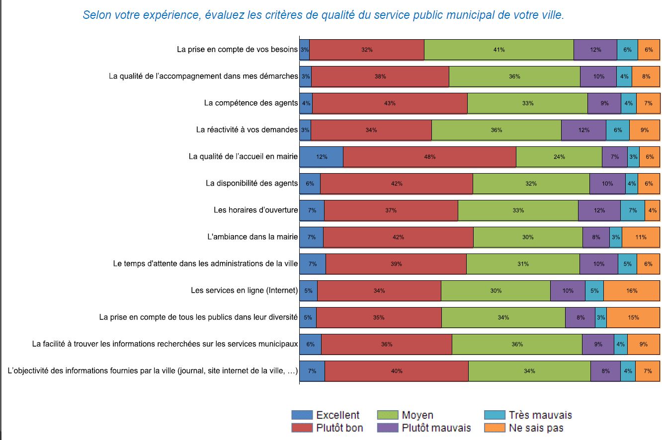 Dans le détail, le principal contributeur à l’évaluation globale est “la qualité de réponse aux besoins”. Si les Français sont particulièrement satisfaits par l’accueil en mairie (57% en ont une évaluation positive), la réactivité aux demandes et la prise en compte des besoins sont évalués plutôt négativement (très mauvais : 19% ; plutôt mauvais : 18%).