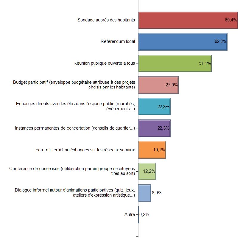 Comme nous avions déjà constaté que ce souhait d’association était important en 2013, nous avons développé une question sur les modes de consultation attendus. La deuxième édition du baromètre montre que les Français préfèrent les procédés modernes de concertation : le sondage arrive en premier (69 %) suivi de près par le référendum (62 %). On note ainsi une certaine défiance face aux formes traditionnelles de concertation qui sont perçues comme servant « à faire semblant ». Par exemple, la réunion publique ou le conseil de quartier sont, certes, un moyen de débattre, mais les citoyens ont l’impression que leur avis n’est pas pris en considération. Ils veulent ainsi des outils d’objectivation qui donnent du crédit à leur concertation. À travers le sondage ou le référendum local, on obtient un résultat net (pour / contre ; oui / non) qui permet d’être plus facilement pris en considération.
