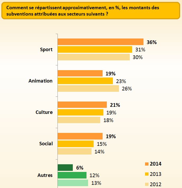 Dans le même temps, les subventions sont déjà à la baisse : 48 % des associations signalent un recul quand 24 % des collectivités reconnaissent une baisse de leur soutien (vs. 10 % en 1013). A noter que les collectivités soutiennent, en volume de subventions, par ordre décroissant, les associations sportives, culturelles puis du champ de l’animation et du social.