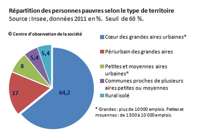 L’institut permet de quantifier ce qui relevait de l’évidence pour de nombreux d’observateurs : les plus démunis vivent dans les communes les plus peuplées, là aussi où habitent les plus riches, et où les inégalités de revenus sont les plus grandes. Le tiers qui reste vit pour 17 % dans les communes périurbaines, pour 13,4 % dans les petites et moyennes agglomérations ou leurs communes proches (2) et 5,4 % dans les communes rurales isolées. La France périurbaine et rural ne regroupe qu’une minorité de personnes pauvres.