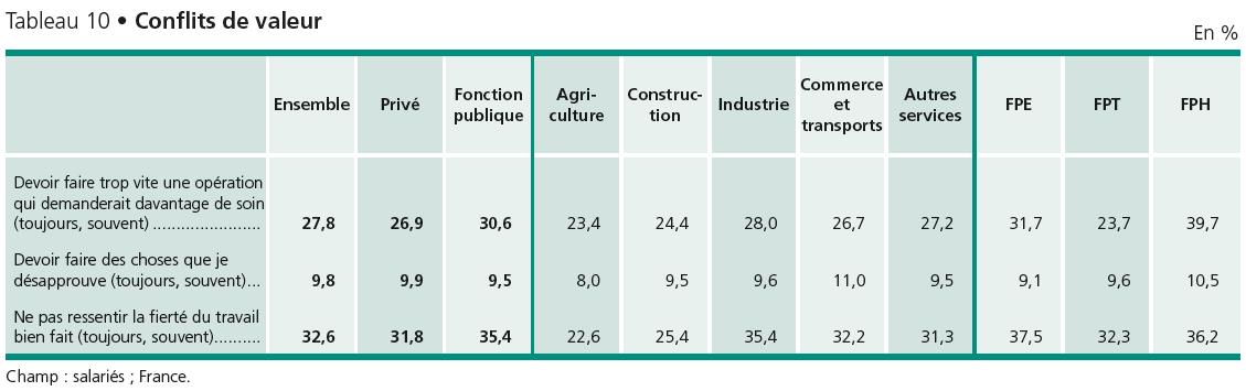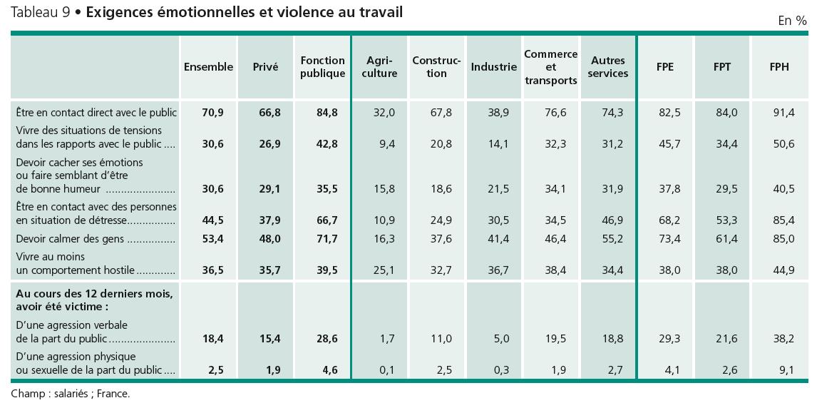 Corolaire de ces tensions, le « travail émotionnel » qui consiste à cacher ses émotions ou à faire semblant d’être de bonne humeur est caractéristique de 31 % des salariés, en particulier dans le commerce, les transports et les fonctions publiques de l’Etat (37,8 %) et hospitalière (40,5 %).