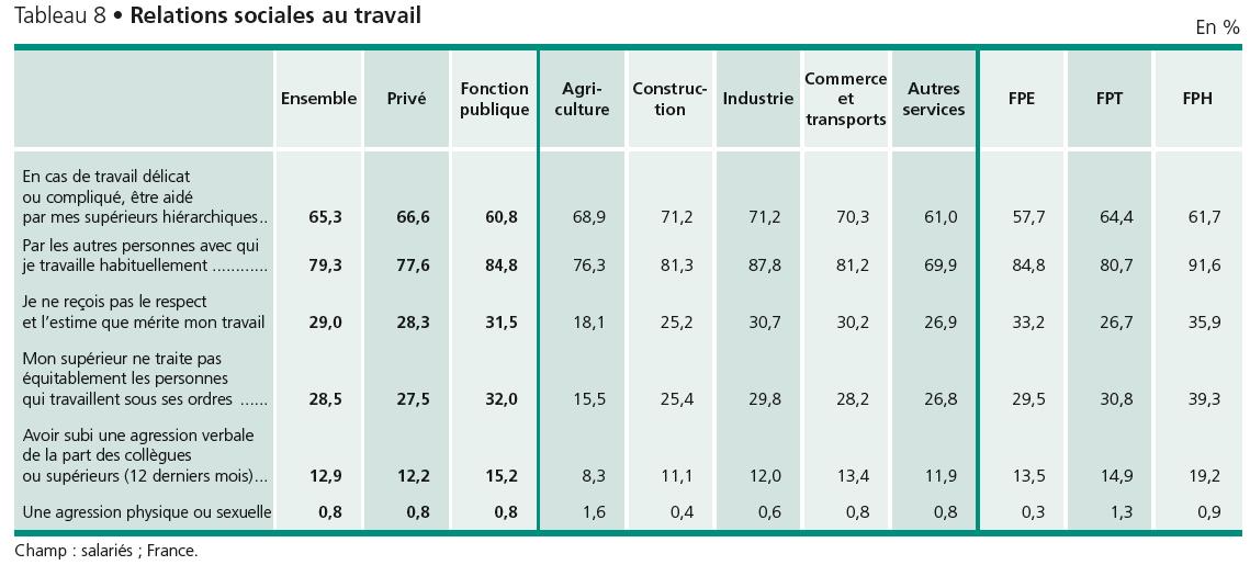 A retenir également : si les fonctionnaires se disent moins soutenus par leur hiérarchie (61 %) que les salariés du privé (67 %), 85 % d’entre eux estiment pouvoir être aidés par leurs collègues en cas de travail délicat ou compliqué (78 % dans le privé).
