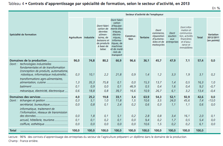 En 2013, 273 000 nouveaux contrats d’apprentissage ont été comptabilisés dans le secteur privé, soit une baisse de 8% par rapport à 2012, après deux années de légère hausse, indique la Dares, tandis que le nombre de contrats d’apprentissage dans le secteur public non industriel et commercial diminuait de 3% seulement. Le nombre d’apprentis, au 31 décembre 2013, a quant à lui fléchi de 3,1% par rapport à 2012. Ceci est dû à une baisse brutale des entrées en apprentissage (-14 700) en 2013, soit 6,5% de moins qu’en 2012.