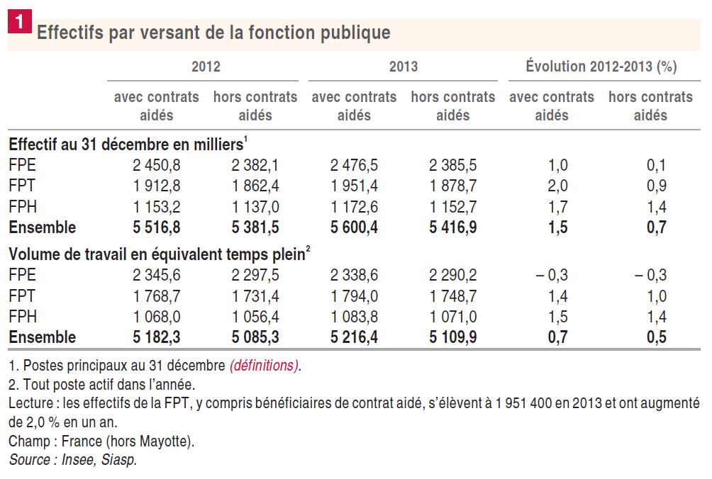 En 2013, le nombre de bénéficiaires de contrats aidés a fortement augmenté (+ 36 %) ; une progression qui concerne les trois versants et explique la moitié de la croissance des effectifs globaux, indique l’Insee. Hors contrats aidés dans la FPT par exemple, la hausse des effectifs n’est pas de 2 % mais de 0,9 %.