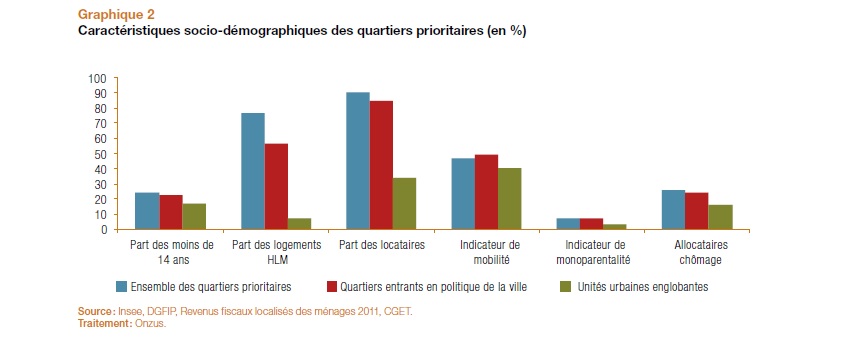 S’il était déjà connu que la réforme permettrait de cibler les zones de concentration de population à bas revenus, le rapport va plus loin et révèle de premiers éléments socio-démographiques portant sur ces 1 300 quartiers prioritaires – qui remplacent désormais les 751 zones urbaines sensibles (ZUS) et les 2 492 contrats urbains de cohésion sociale (CUCS).