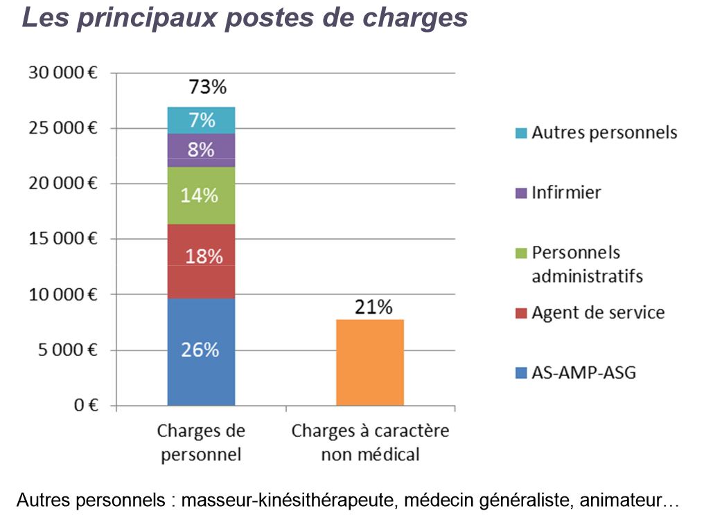 Principaux postes de charges – Le premier poste de charges est celui des charges de personnel. Il représente 73 %du coût annuel à la place (26 960 €).