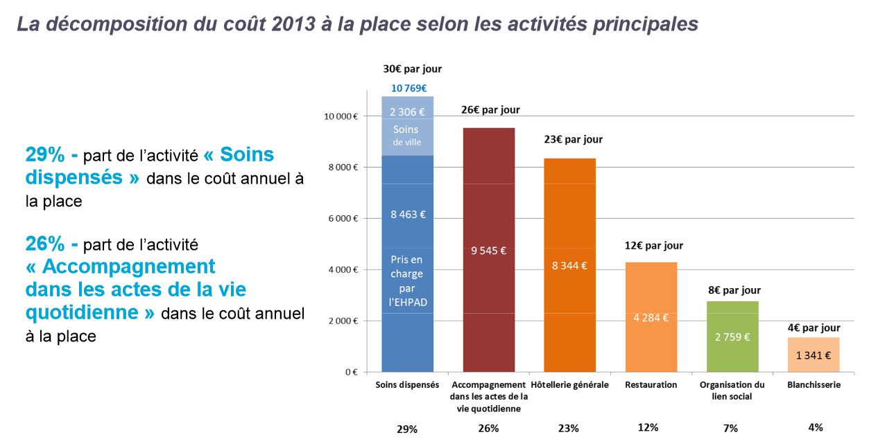 Le coût moyen 2013 (soins de ville inclus et hors charges financières et de structure immobilière) supporté par l’ensemble des financeurs (résidents et leur famille, conseils départementaux et assurance-maladie) est estimé à 37 043 €annuels par place soit 101 € par jour.