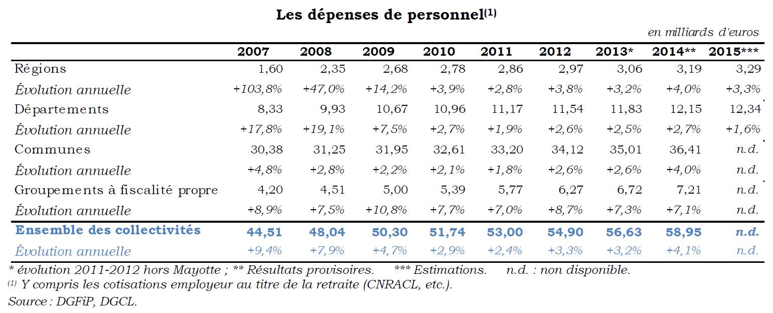 Les dépenses de personnel pourraient ainsi progresser de façon moins soutenue qu’en 2014, dans tous les niveaux de collectivités, conclut le rapporteur.