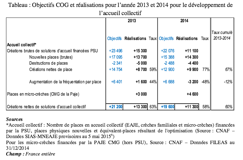 Le HCF pointe également une augmentation des destructions de places. Ainsi, 4 400 places ont été détruites au lieu des 2 500 attendues. La Cnaf a tenté de juguler cela en augmentant le fonds dédiés à la restauration des établissements. Mais cela n’a pas encore porté ses fruits. Le total de l’offre de solutions d’accueil en EAJE financé par PSU s’est ainsi accru de 6 700 en 2014. Si l’on ajoute les places créées par les micro-crèches financées par le complément mode de garde (CMG) dit « structure », soit tout de même 4 600 places, on atteint seulement 58% de l’objectif fixé en 2014 pour l’accueil collectif.