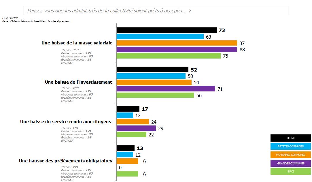 Et cette baisse est une mesure acceptable par les administrés, selon les répondants. La plus acceptable de tous les leviers (baisse de l’investissement, baisse du service rendu et hausse des prélèvements obligatoires sont les autres leviers cités).
