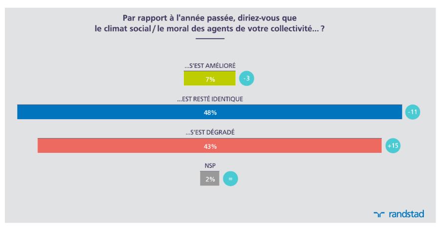 Autre résultat significatif, la part des communes constatant une dégradation de leur climat social (43 %) est en forte augmentation sur un an (+ 15 points).