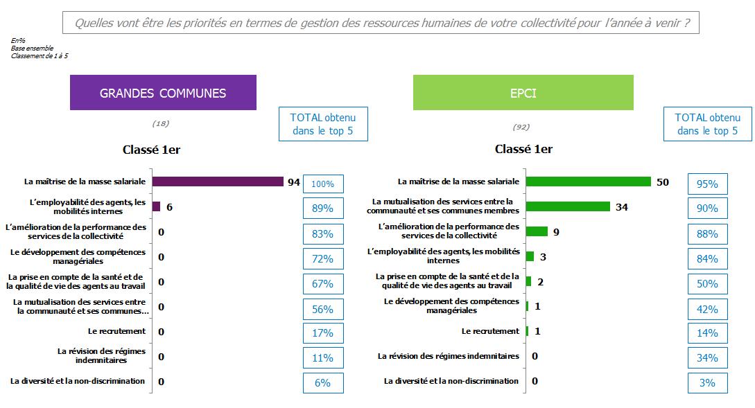 Ce baromètre renseigne aussi sur les priorités en termes de gestion des ressources humaines pour 2015. La maîtrise de la masse salariale arrive largement en tête (58 % des répondants), contre 21 % pour la priorité « mutualisation des services ».